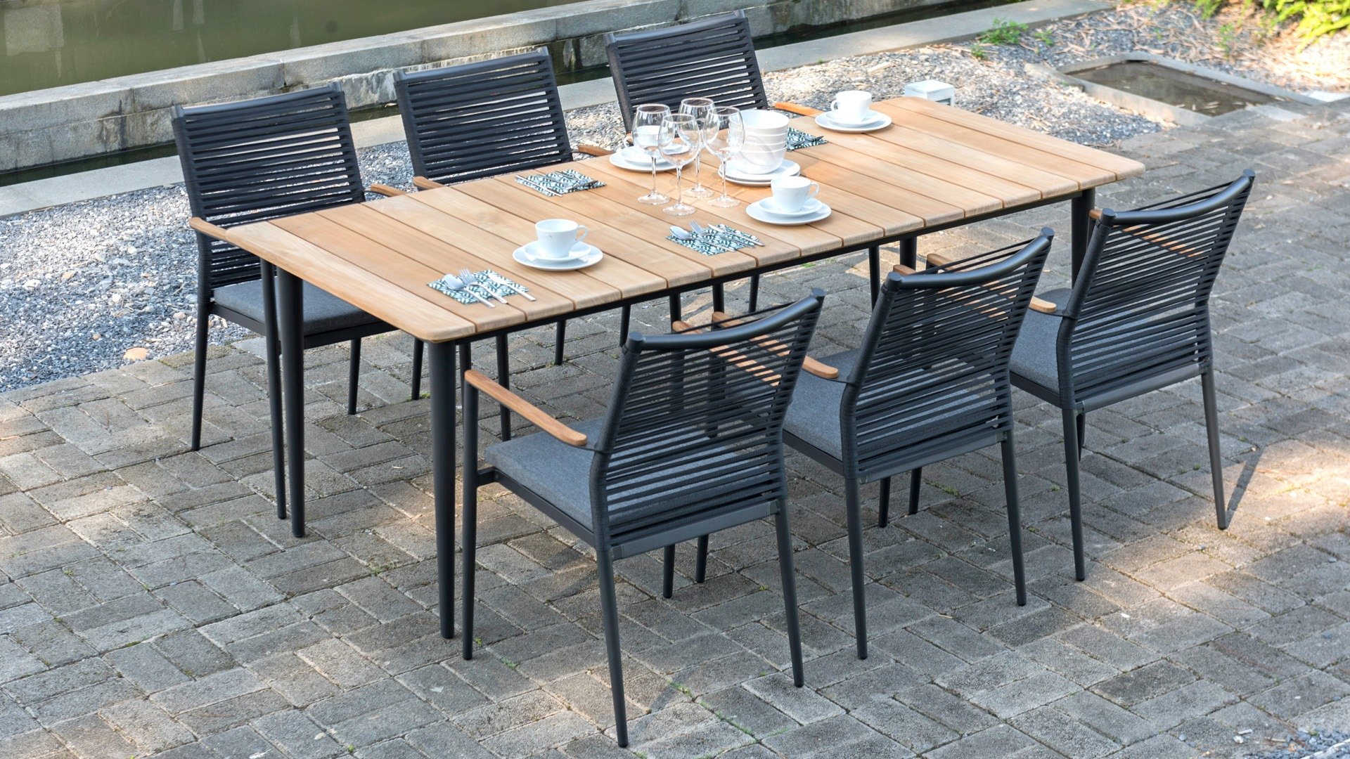 Die Zebra Greenline Spider Dining-Serie. Ein stapelbarer Stuhl, dessen Rahmen mit pulverbeschichtetem Graphit-Aluminium zusammen mit dunkelgrauem Batyline®-Stoff bezogen ist. Das verwendete Batyline® Textilene ist ein bewährtes synthetisches Gewebe, das atmungsaktiv und über mehrere Jahre reißfest ist. Die Rückenlehne ist aus Rope, die Textilene-Sitzfläche hat ein bequemes Sitzkissen. Die Greenline-Serie von Zebra vereint unter anderem Zeitgenössisches, Ökologie und Nachhaltigkeit. Im Unternehmenskonzept Greenline steht das Thema Nachhaltigkeit und die Auswahl umweltfreundlicher Materialien.